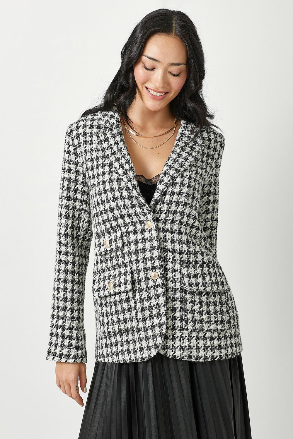 Houndstooth Double Breast Jacket Coat Silver sparkle throughout Double button closure Pockets and 60289 skirt -Self 100% Polyester / Lining 92% Polyester, 8% Spandex